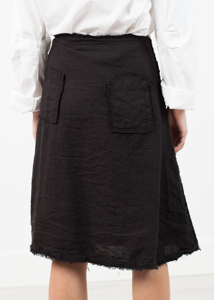 The Wrap Snap Skirt by Pip-Squeak Chapeau has a slight flare through the knee. With raw seams and hems, this wrapped skirt is versatile, light, and unfussy. Snap button at front waistband with back detail pockets. Color Black. 100% Linen. Made in U.S.A. One Size.